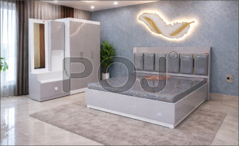 The stylish bed features a padded headboard with a sleek panel design, offering excellent back support and a refined look. The sturdy platform base ensures durability and long-lasting comfort. The matching wardrobe provides spacious storage with smooth-finish shutters, ideal for organized living. A modern dressing table with mirror and drawer adds convenience while enhancing the room’s aesthetic appeal.