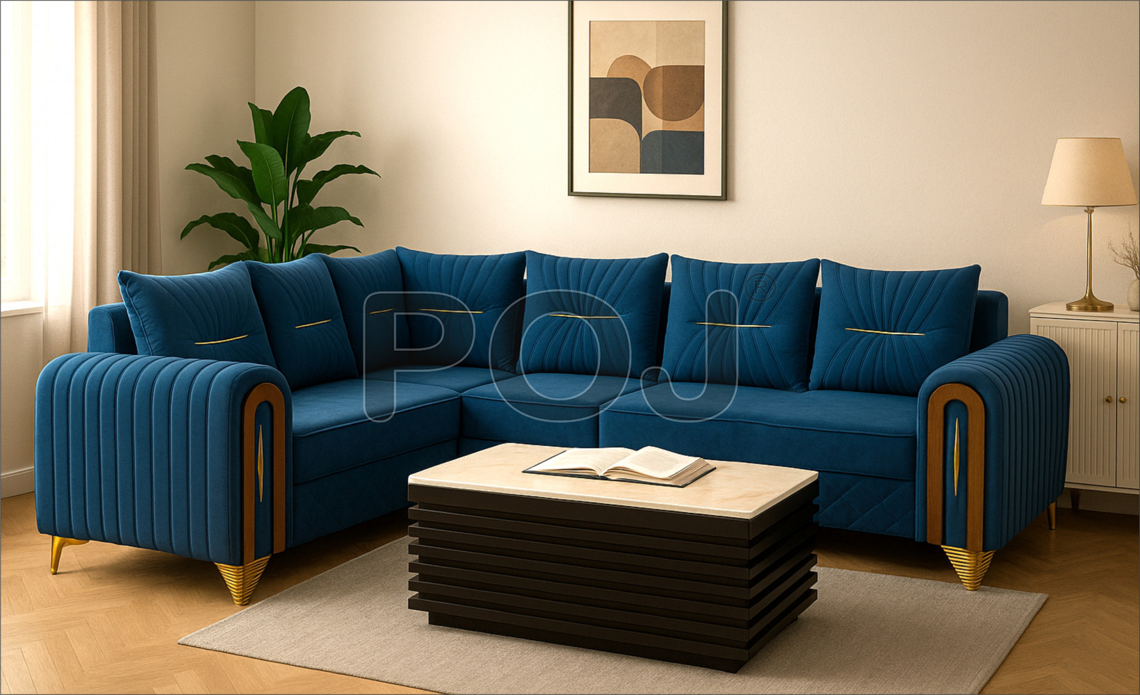 Transform your living room into a modern retreat with this stunning L-shaped sofa set in rich royal blue. Designed for both style and comfort, it combines premium upholstery with plush cushions and elegant detailing. Perfect for family gatherings or lounging in style.