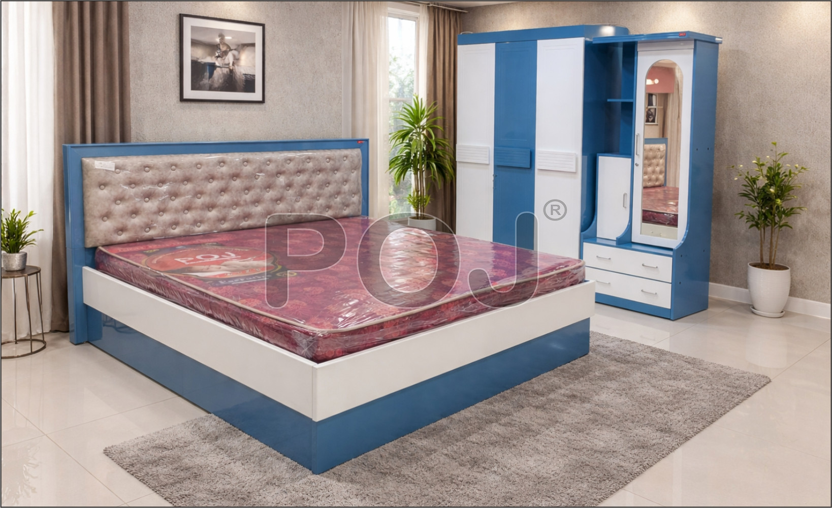Upgrade your bedroom with this elegant modern blue and white bedroom set, designed to bring comfort, style, and functionality together. The set features a sturdy bed with a soft, button-tufted upholstered headboard that provides excellent back support and adds a premium look to your space.