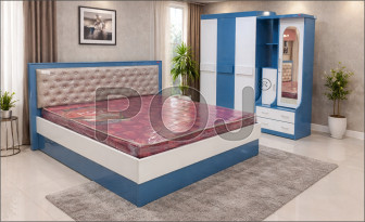 The matching spacious wardrobe comes with smooth-opening doors, ample hanging and storage space, and a full-length mirror that enhances both convenience and room aesthetics. The combination of soothing blue and crisp white finishes creates a refreshing, contemporary feel that complements modern interiors.